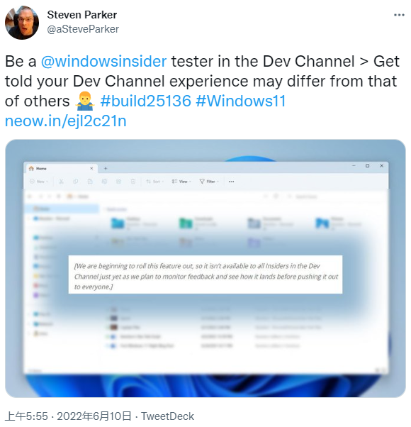 在启用 Windows11 的选项卡式文件资源管理器功能前,你需要先将计算机更新到 Dev 频道 Build 25136 编译版本。