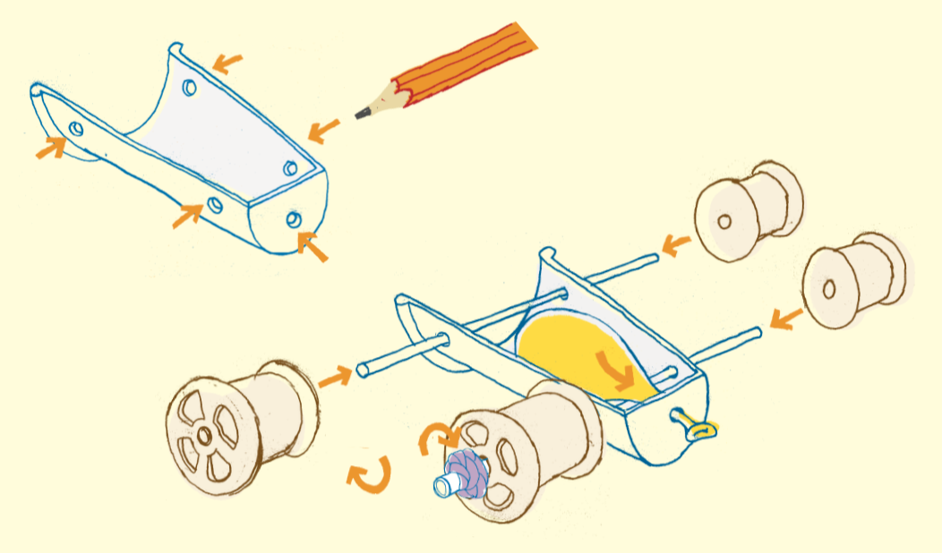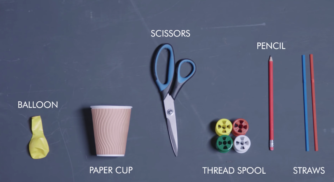 材料:一个气球、一个纸杯、两根塑料吸管、四个棉线轴、剪刀、铅笔