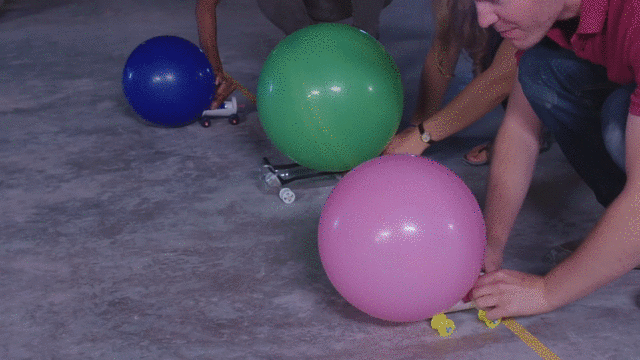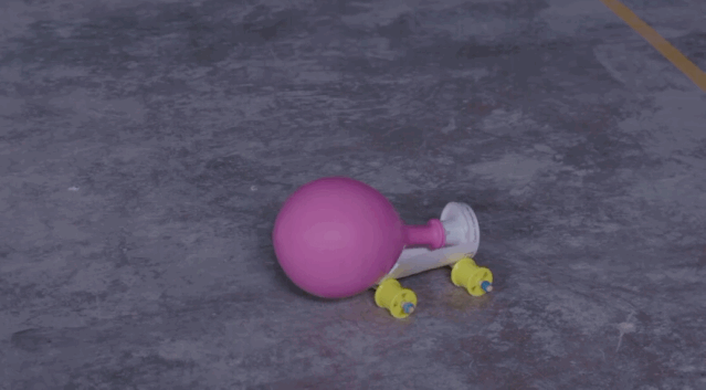 5.对气球吹气,到气球鼓起来后放手,小车就会开起来啦!