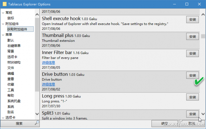 像安装驱动器图标那样,由于Tablacus Explorer支持附加组件功能,这样我们可以通过获取更多的附加组件,点击安装即可让文件浏览器多一个别的本事。