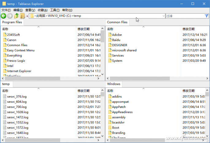 除了用标签管理文件夹窗口外,还可以使用多窗格的方式来管理文件。在一个窗口中同时显示2个或4个窗格,这样可以对比多个文件夹同时操作,实现文件复制、移动等常规操作。